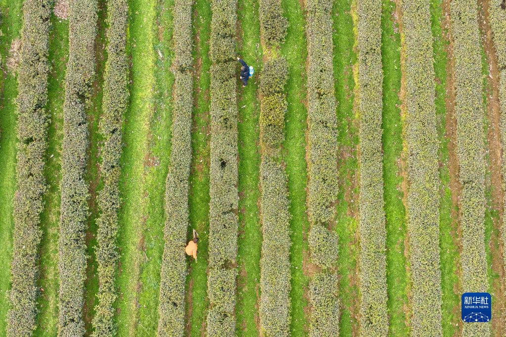 2月17日,茶農在湖北省丹江口市土關埡村武當茶谷勞作(無人機照片)。