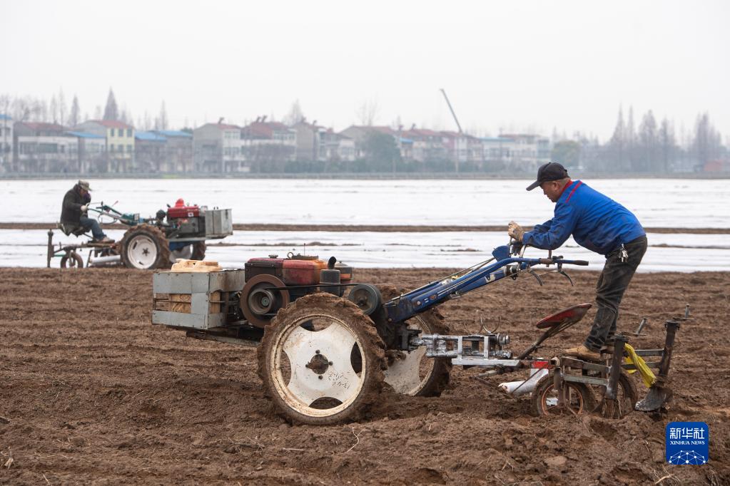 初春時節,湖北省各地農民搶抓農時,翻整田地,播種施肥,呈現一派繁忙景象。