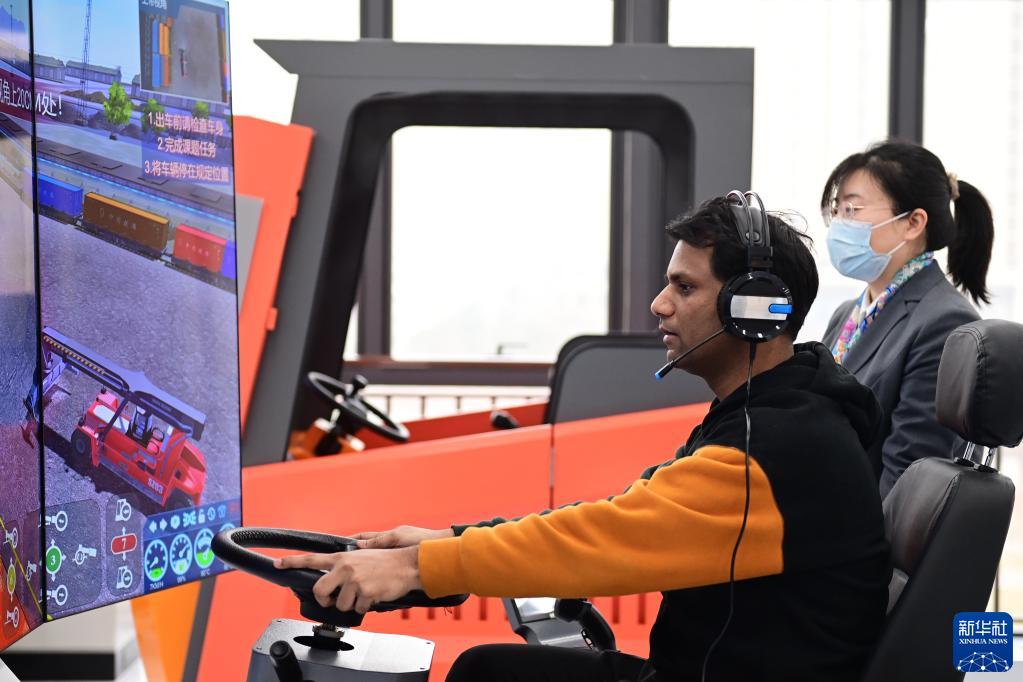 2月17日,在西鐵教育培訓基地,西安交通大學的印度留學生樂輝(前)在貨裝實訓室體驗模擬駕駛。