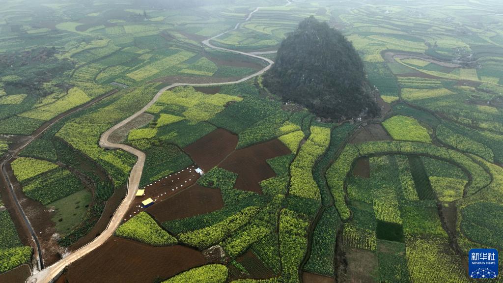 2月17日拍攝的貴州省六盤水市六枝特區木崗鎮萬畝油菜基地(無人機照片)。