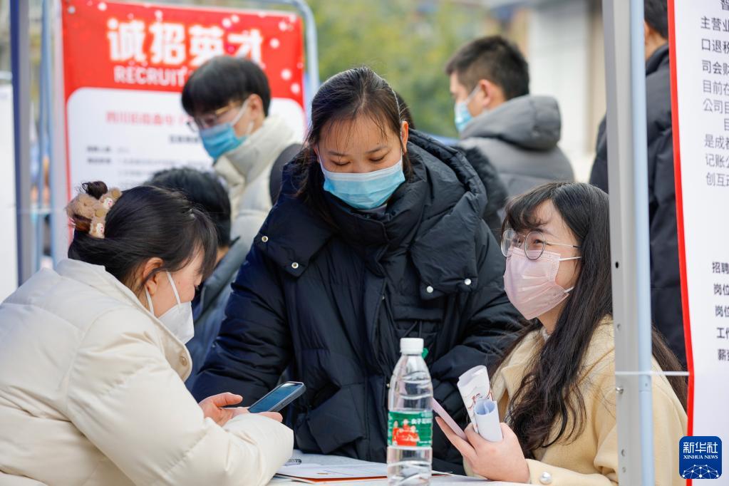 2月17日,在中國成都人力資源服務產業園,求職者(前右)與招聘企業工作人員交流。
