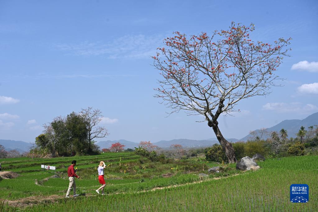 眼下正值海南昌江黎族自治縣木棉花盛開時節,不少游客前來踏青賞花。