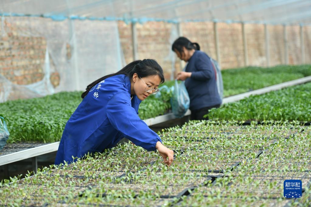 2月17日,張莎莎(左)在育苗棚內查看秧苗長勢。