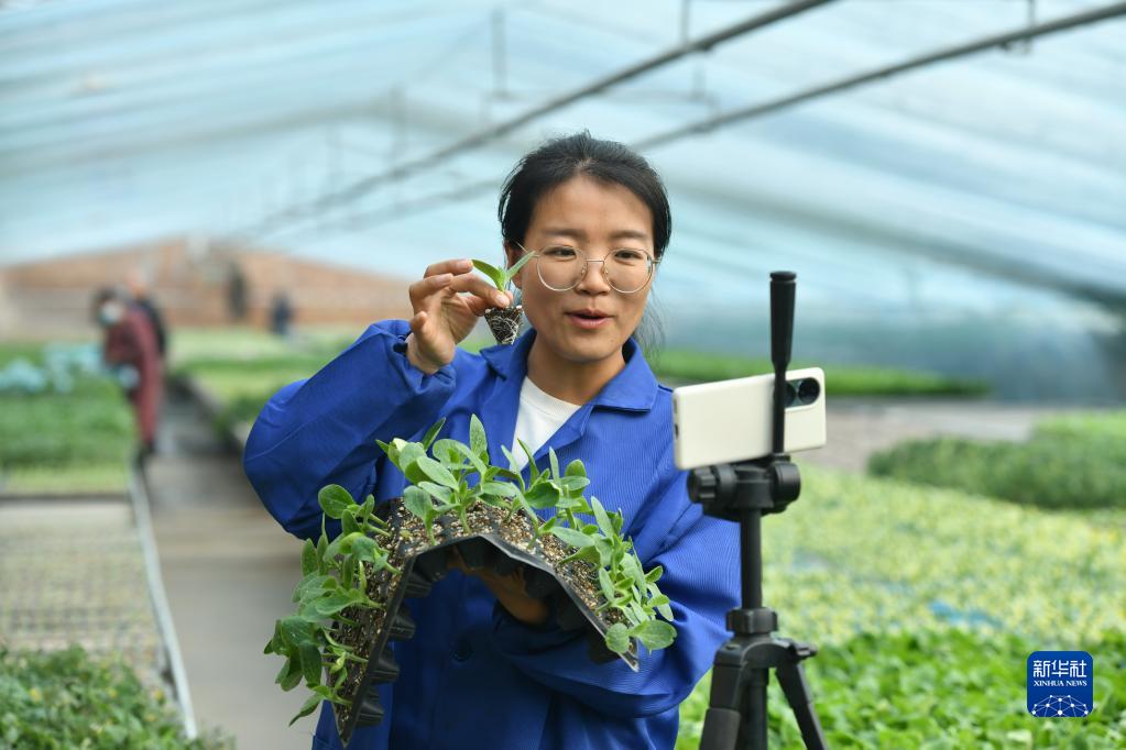 2月17日,張莎莎在育苗棚內通過直播的方式推介產品。
