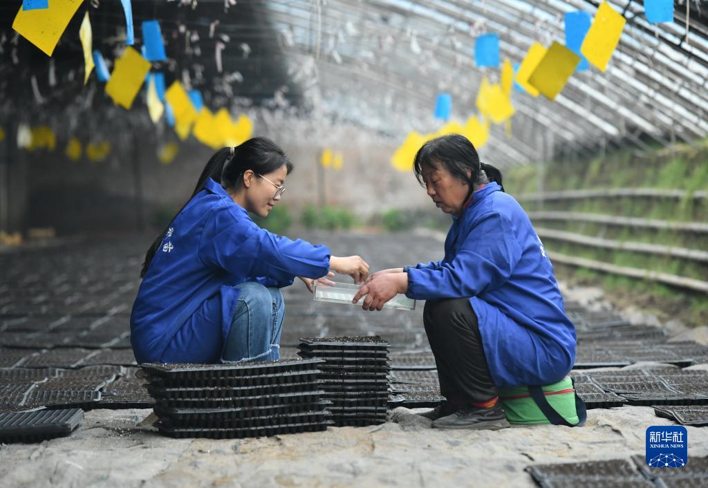 2月17日,張莎莎(左)在育苗棚內進行播種工作。