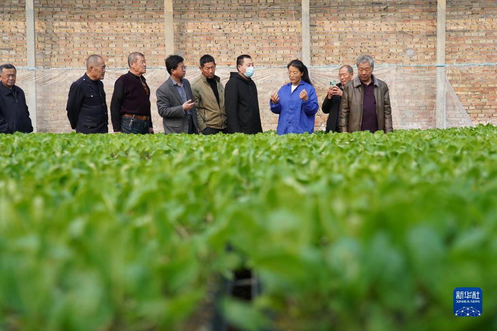 2月17日,張莎莎(右三)為前來參觀學習的外縣群眾講解秧苗培育技巧。