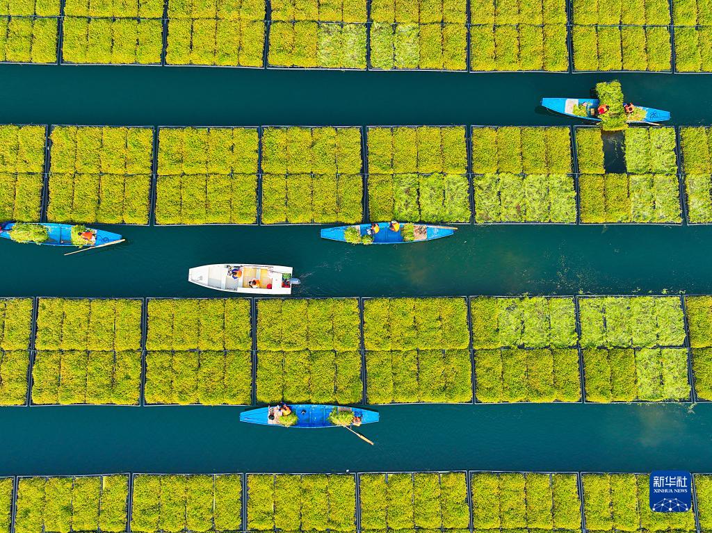 近年來,浙江省杭州市淳安縣在千島湖典型庫灣、入湖口等區域,積極運用生態浮島水上植物無土栽培技術種植空心菜、水芹菜等水生蔬菜,直接吸收庫區水體中氮磷等元素,從而能夠有效地降低水體中營養物質的含量,提升水質。近日,水生蔬菜進入采收季節,“湖上菜園”呈現春收繁忙景象。