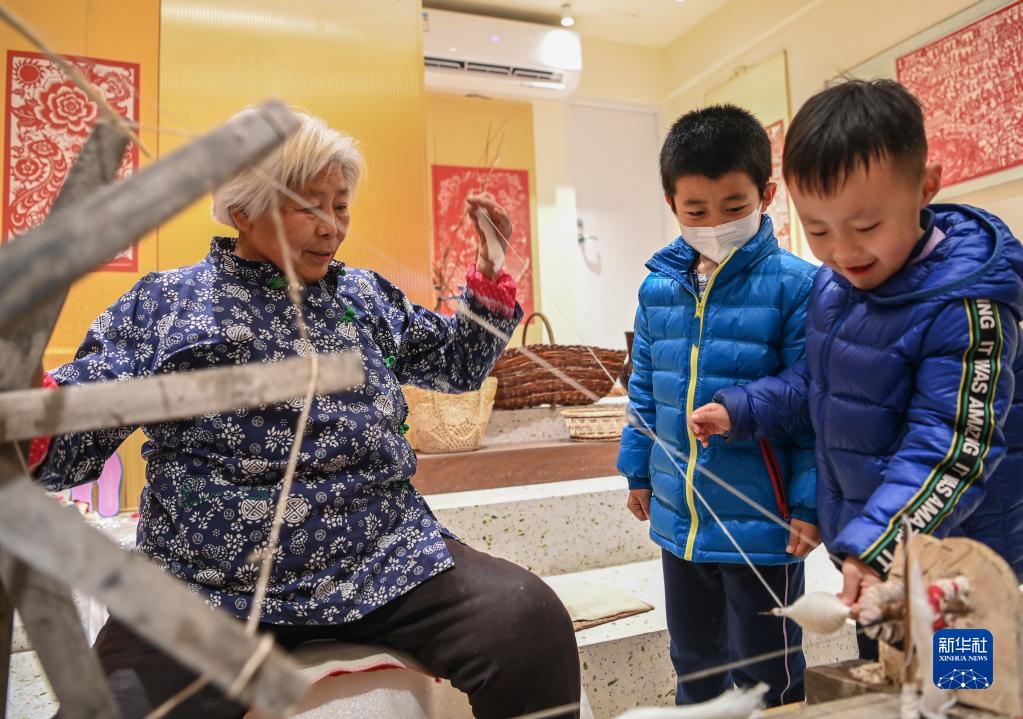 在榆林老街非遺大集的非遺展館內,非遺傳承人王秀芳(左)展示紡線織布技藝(2月17日攝)。
