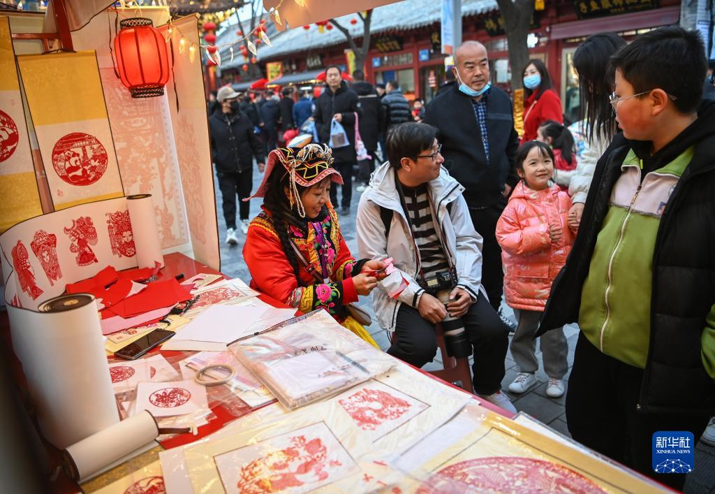 游客在榆林老街的非遺大集上欣賞剪紙技藝(2月17日攝)。