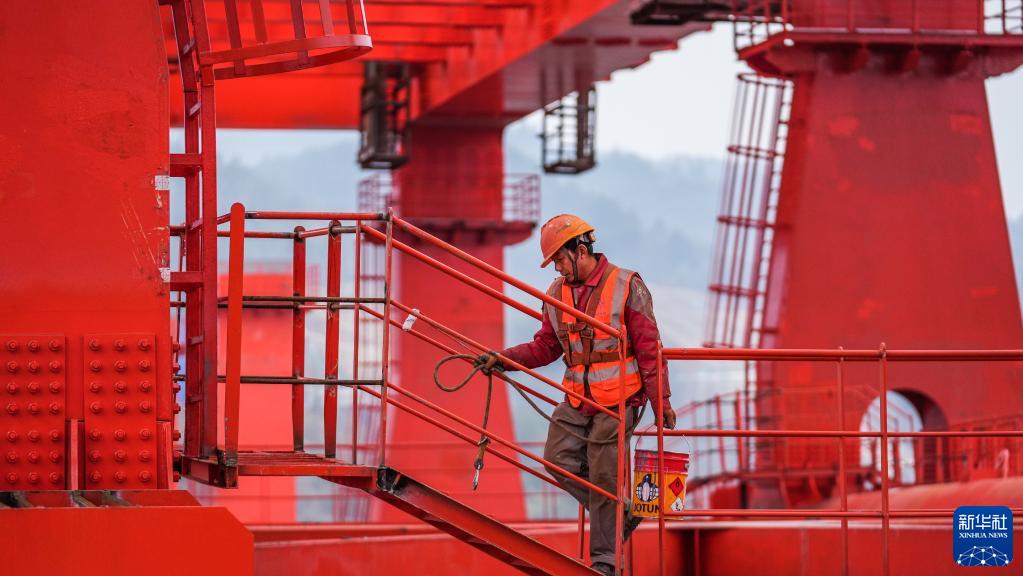 中交一公局工人在德余高速烏江特大橋橋梁上行走,前往施工點(2月16日攝)。