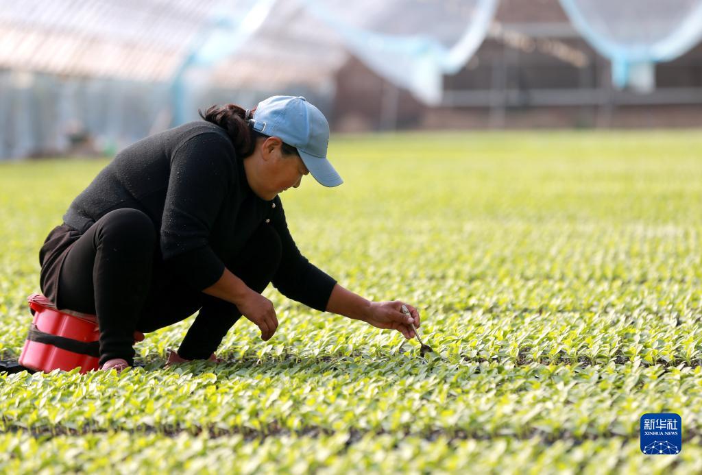 在蘭考縣儀封鎮新發地蜜瓜種植基地,技術人員在進行蜜瓜育苗(2月17日攝)。目前,蘭考縣發展蜜瓜種植3萬余畝,形成集育苗、種植、銷售、加工等環節的全產業鏈服務體系。