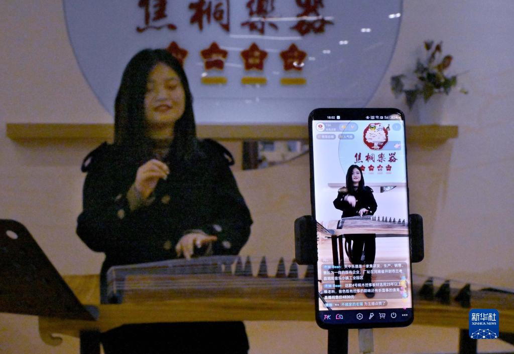 在位于蘭考縣堌陽鎮的音樂小鎮里,生產廠家通過網絡直播銷售古箏(2月16日攝)。