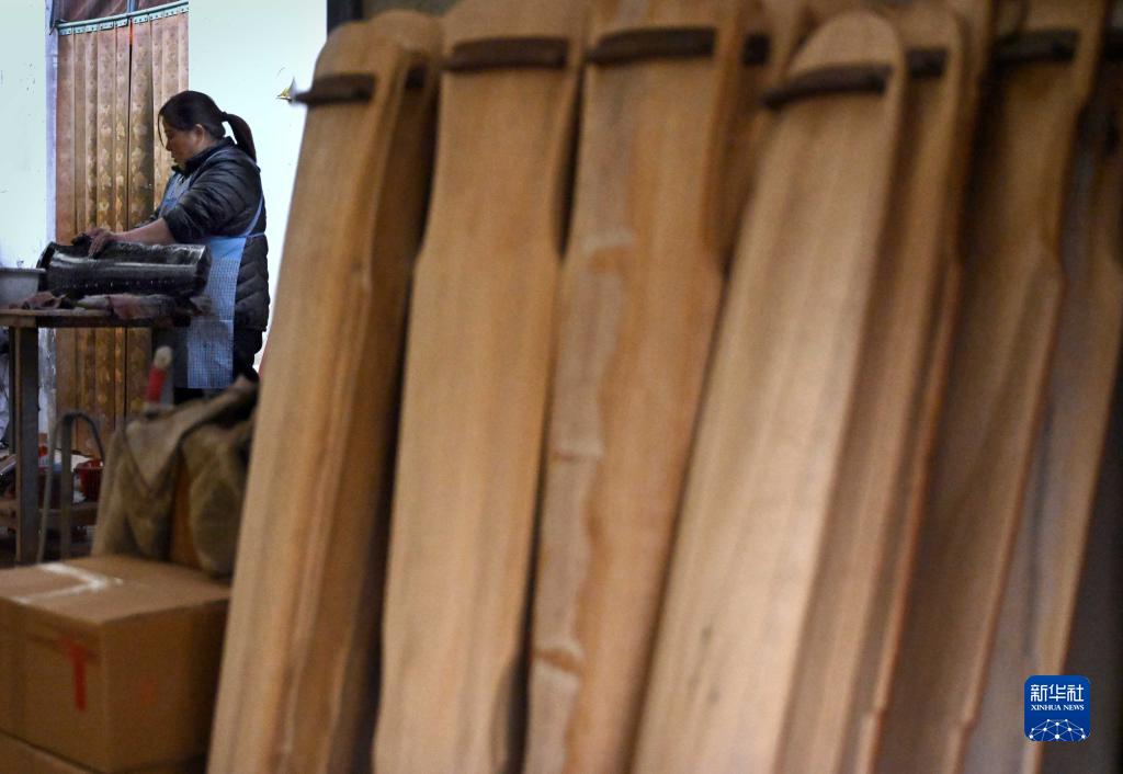 在蘭考縣堌陽鎮徐場村的一處民族樂器家庭作坊里,村民在制作古琴(2月16日攝)。徐場村105戶村民里,90余戶都從事民族樂器加工制作,村內形成原材料加工、產品及配件制作、包裝為一體的產業鏈。