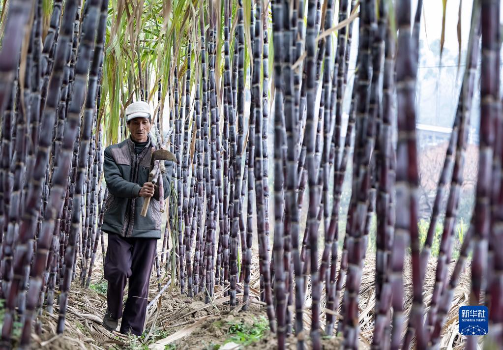 2月18日,村民在貴州省安順市關嶺布依族苗族自治縣斷橋鎮斷橋村田間管護甘蔗。