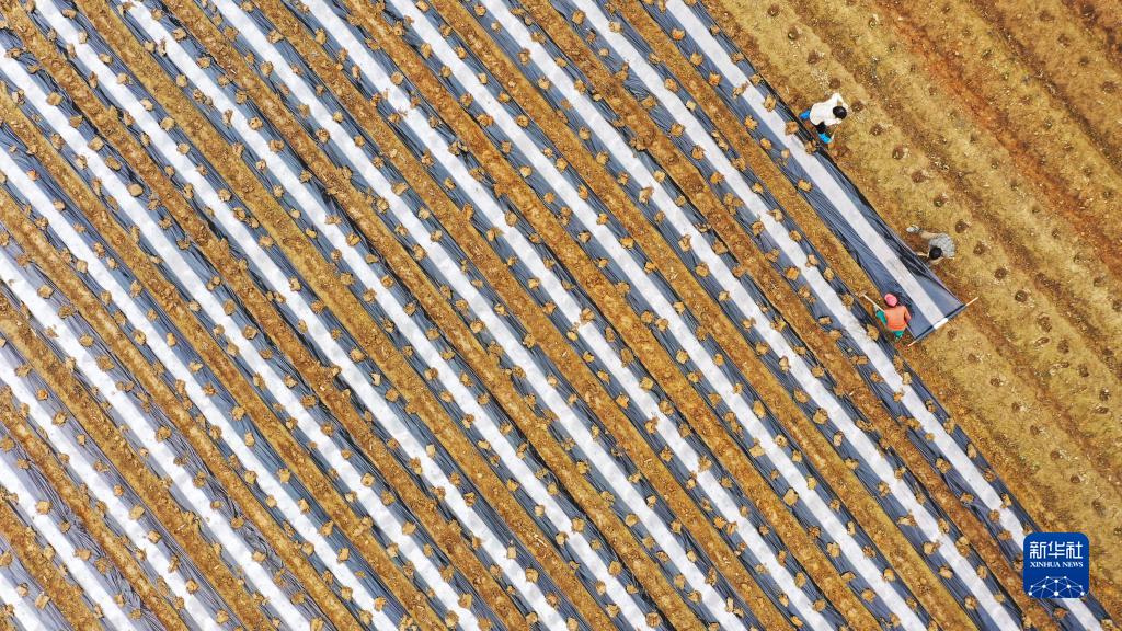 2月18日,湖南省永州市新田縣驥村鎮黃公塘村,農民給剛移栽的農作物覆蓋地膜保溫(無人機照片)。