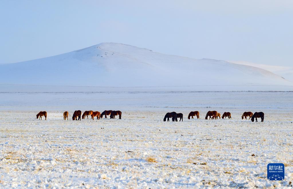 2月18日,馬群在霍林郭勒市額侖草原雪地里覓食。