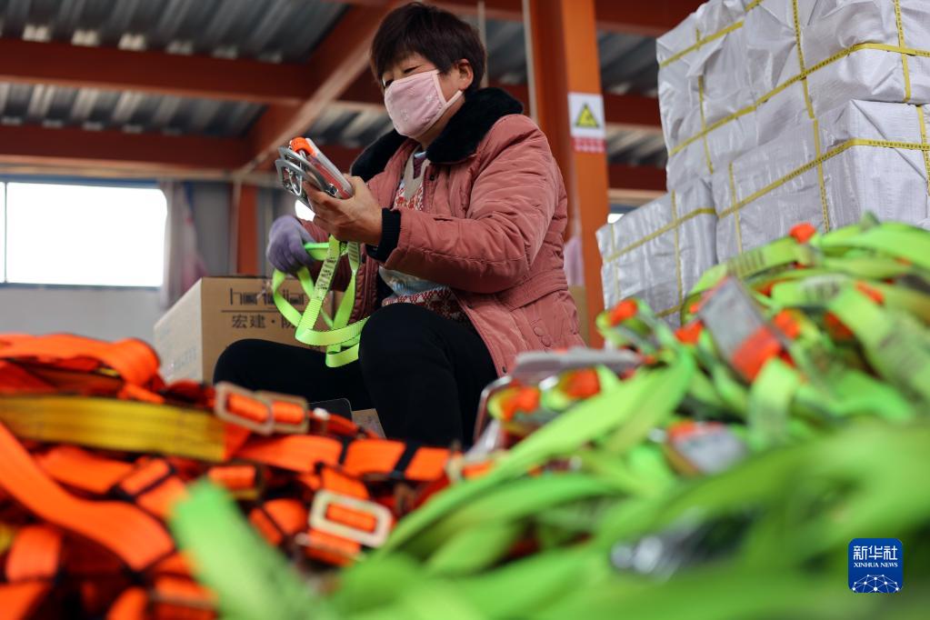 2月18日,山東省濱州市惠民縣姜樓鎮一家繩網企業工人在趕制一批來自國外的安全帶訂單。