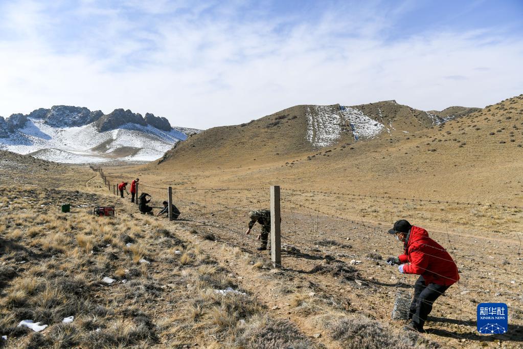 2月17日,哈拉烏管理站門洞子管護站的管護員在修理防護欄。