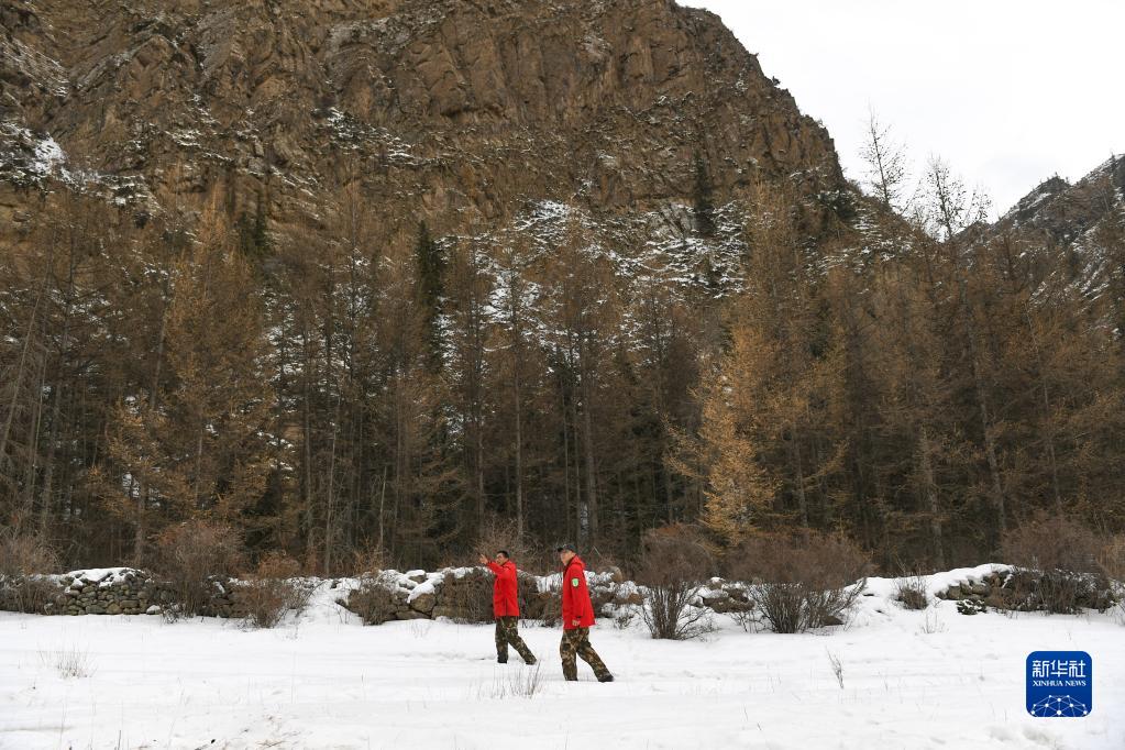 2月17日,哈拉烏管理站副站長李東(左)與管護員達來在保護區內巡護。