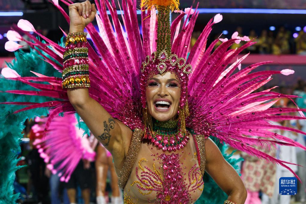 2月17日晚,在巴西里約熱內盧桑巴大道,一名桑巴舞校演員參加狂歡節游行。