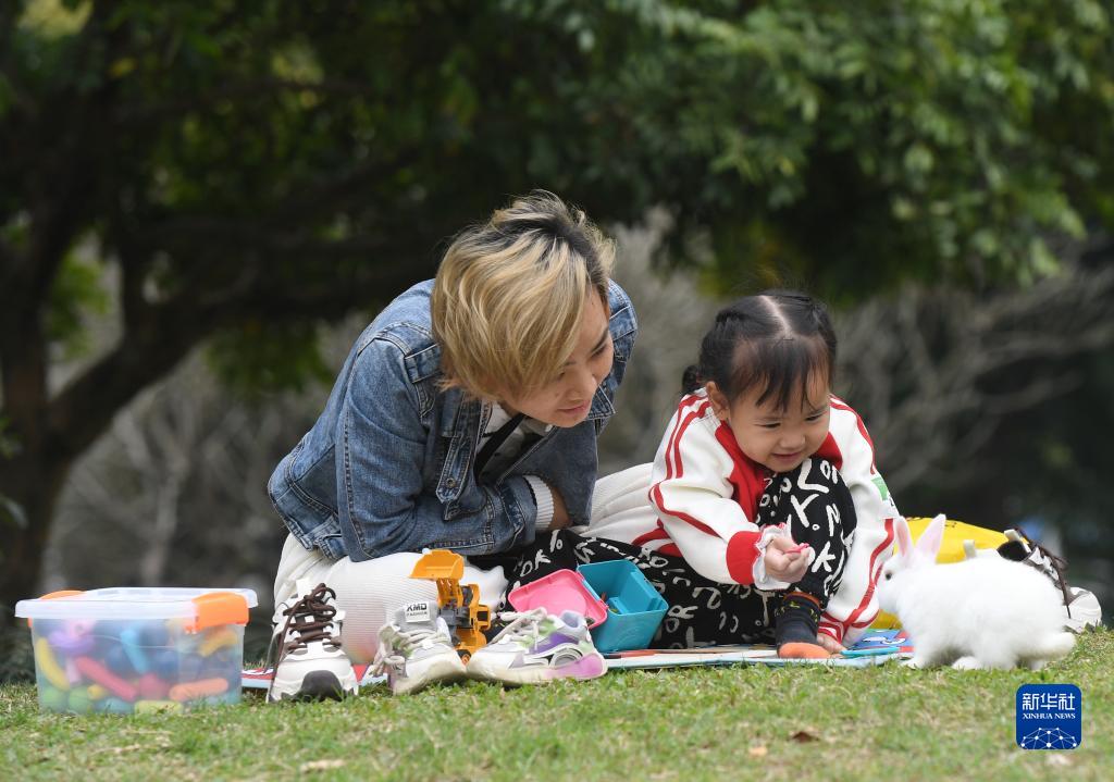 2月18日,小朋友和家人在廣西南寧市南湖邊逗玩自家養的小白兔。