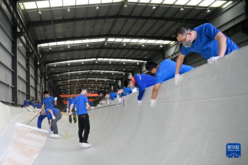 2月18日,在武威市涼州區一家風電裝備生產企業,工人在風機葉片生產線上工作。