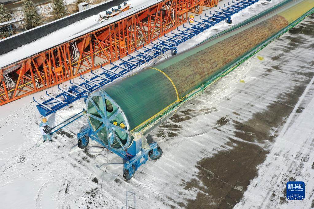 2月18日,在武威市涼州區一家風電裝備生產企業,工人檢查風機葉片(無人機照片)。