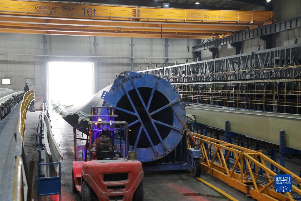 2月17日,在酒泉經濟技術開發區的一家風電葉片制造企業,工人在運輸風機葉片。
