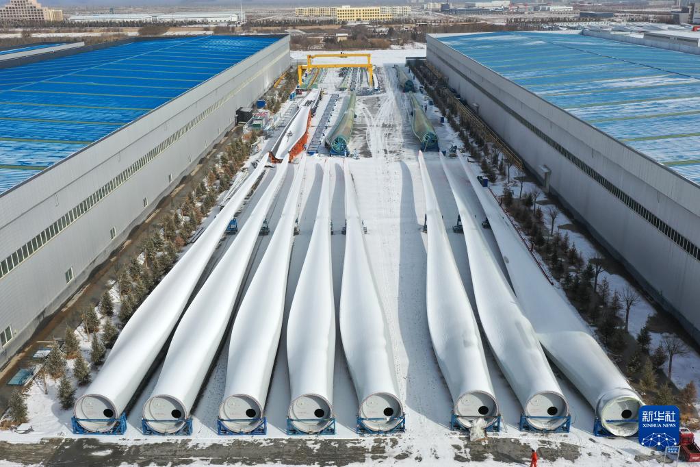 這是2月18日在武威市涼州區一家風電裝備生產企業拍攝的風機葉片成品(無人機照片)。