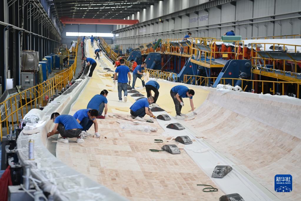 2月18日,在武威市涼州區一家風電裝備生產企業,工人在風機葉片生產線上工作。