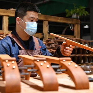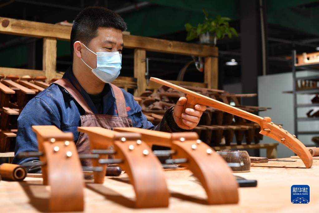 2月18日,河北省肅寧縣一家民族樂器生產企業的工人在生產車間內制作樂器。