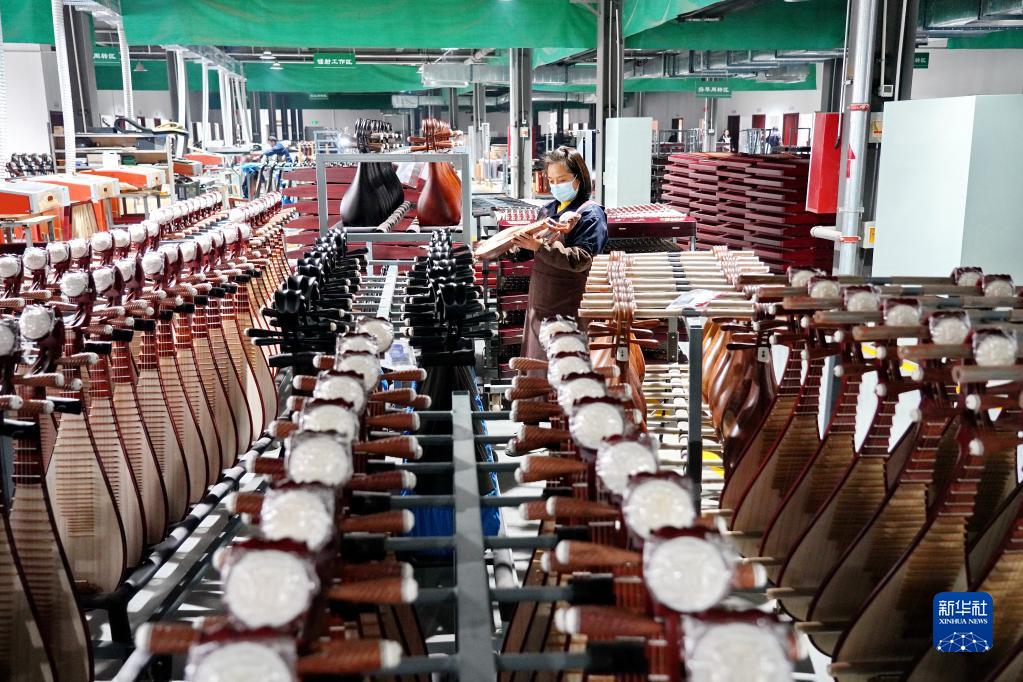 2月18日,河北省肅寧縣一家民族樂器生產企業的工人在生產車間內整理樂器。
