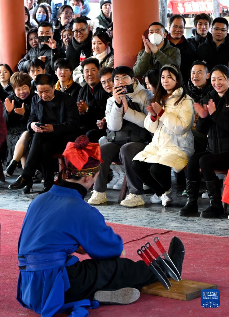 游客在開封清明上河園景區內觀看民俗表演(2月14日攝)。