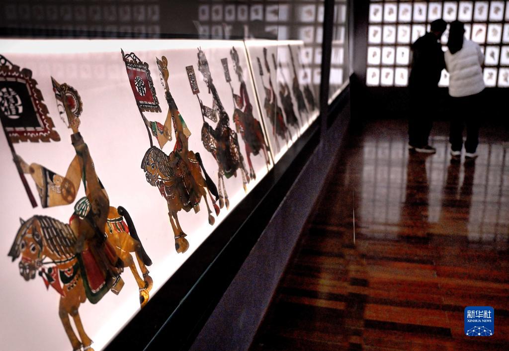 游客在開封清明上河園景區內觀看展示的皮影(2月14日攝)。