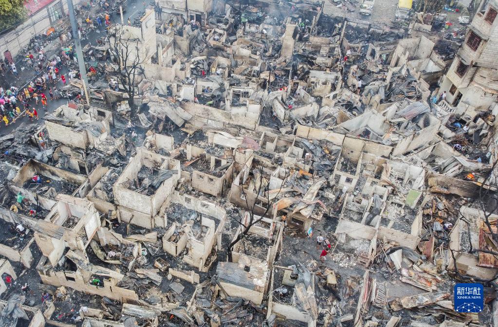 這是2月19日在菲律賓奎松拍攝的被燒毀的房屋(無人機照片)。
