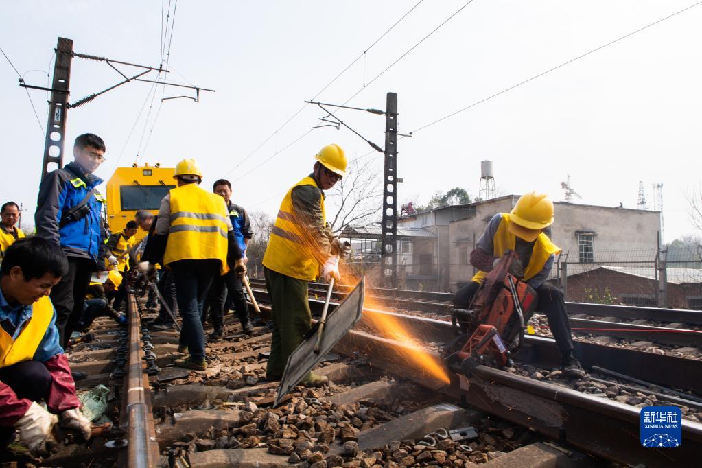 2月19日,在滬昆鐵路婁底至湘潭東區間,鐵路工人在鋸軌。