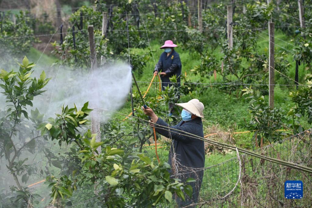 2月19日,四川省內江市東興區高梁鎮方家溝村村民在果園內進行病蟲害防治。