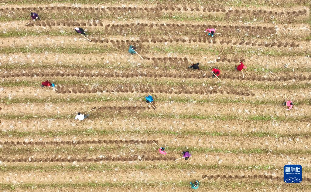 2月19日,在湖南省衡陽市祁東縣白地市鎮,村民在田間勞作(無人機照片)。