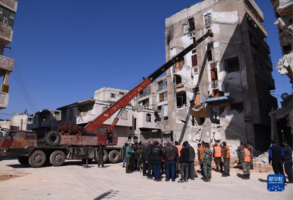 2月18日,在敘利亞哈馬省,人們從地震受損建筑中轉移家具和物品。