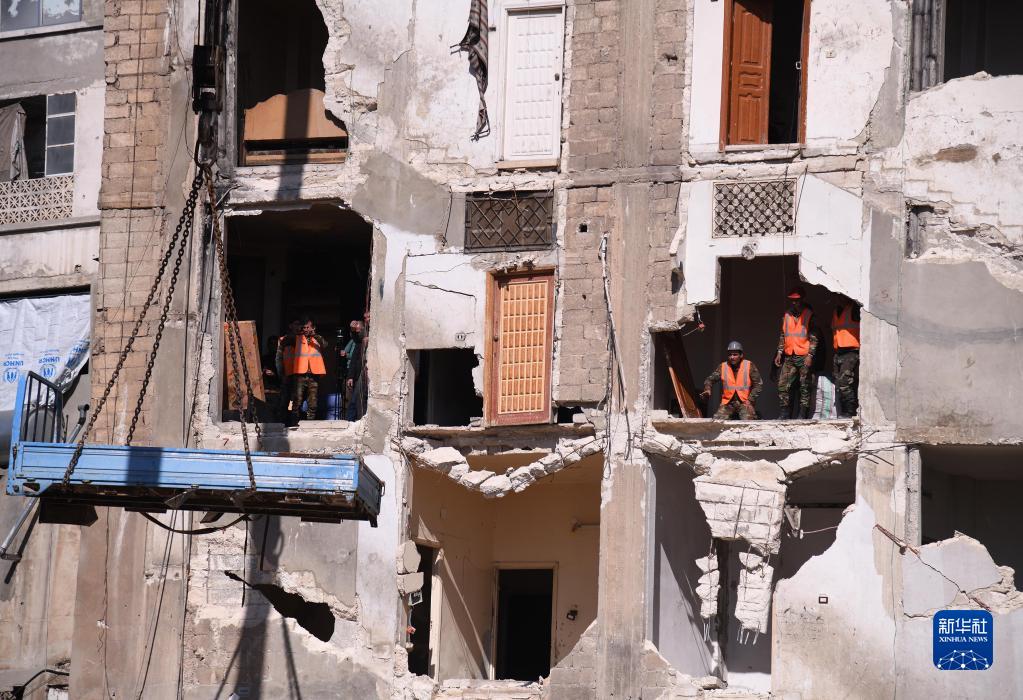 2月18日,在敘利亞哈馬省,人們從地震受損建筑中轉移家具和物品。