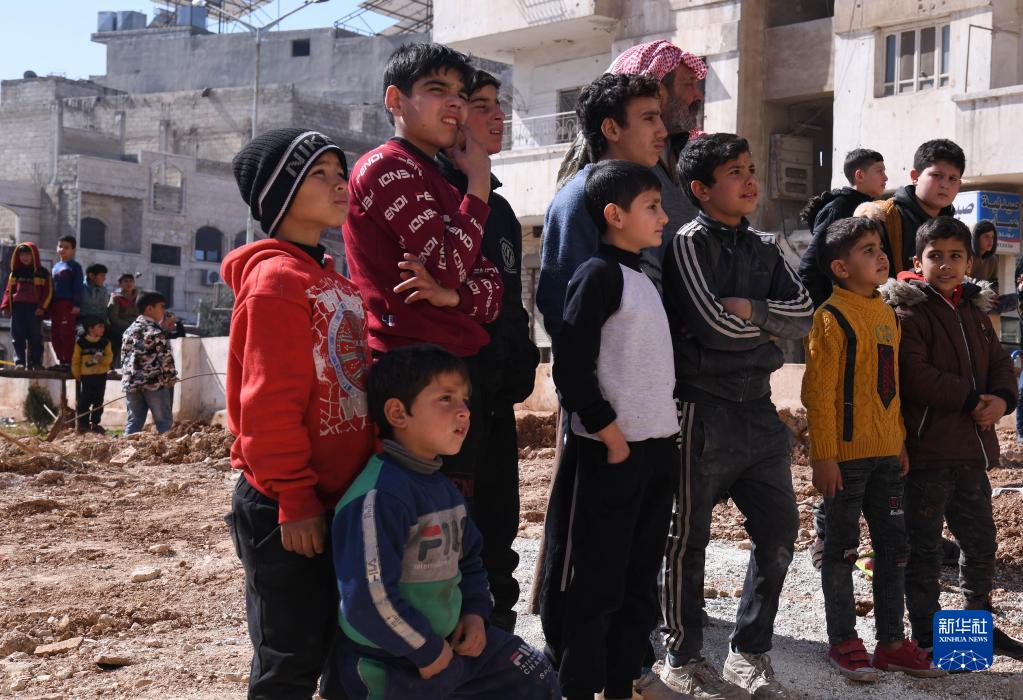2月18日,人們聚集在敘利亞哈馬省一處地震受損建筑附近。