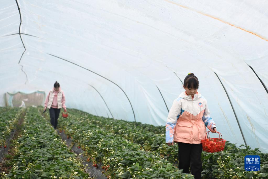 2月18日,孩子和家長(左)在馬郢社區采摘草莓。