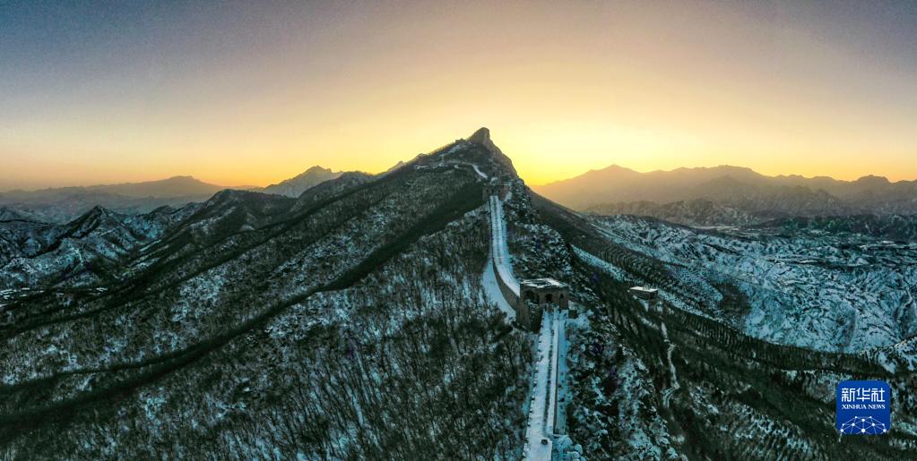 2月19日,這是在晨曦中拍攝的雪后司馬臺長城(無人機照片)。