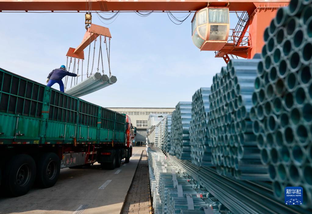 2月19日,工人在唐山市豐南區一家鍍鋅鋼管企業倉儲區操作設備吊裝鍍鋅鋼管。