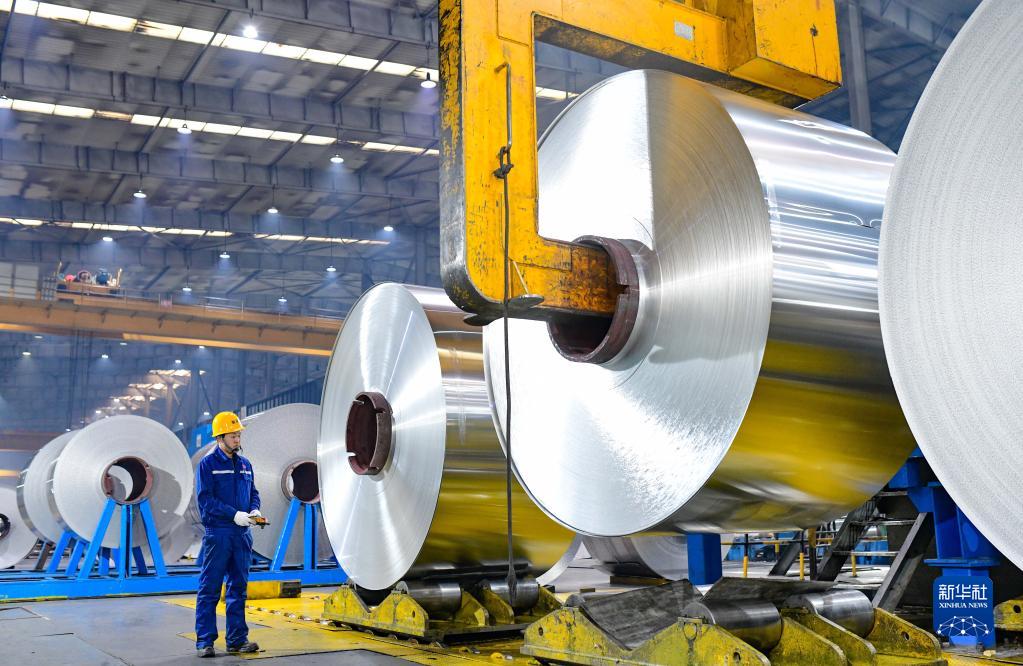 2月19日,在霍林郭勒市一家鋁業公司,工人在鋁箔生產線上作業。