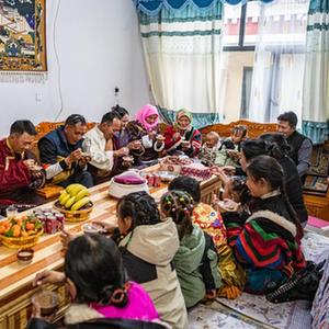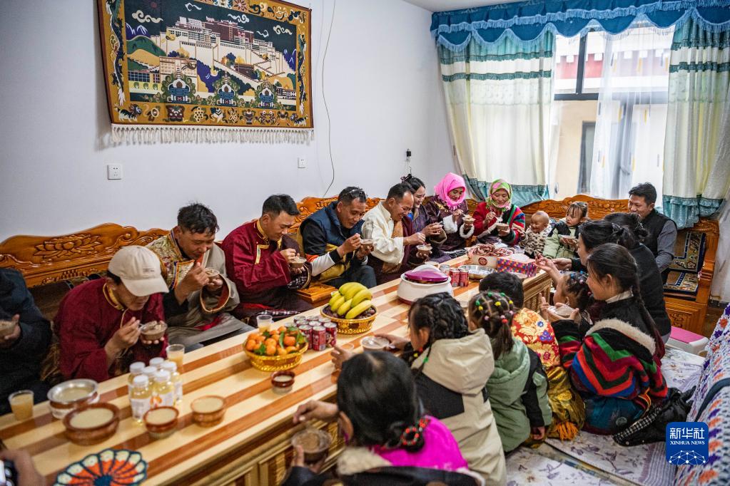 在位于森布日安置點的家中,石秀次仁一家正在吃“古突”(2月19日攝)。