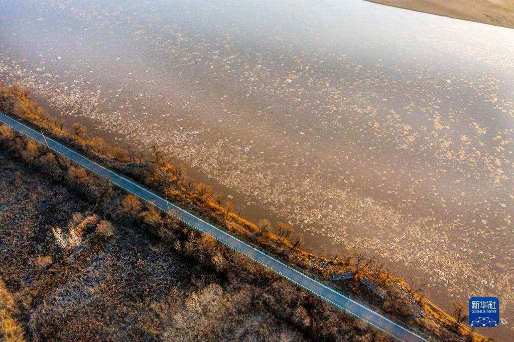 2月19日,在黃河流域的陜西省渭南市合陽段拍攝的黃河冰凌漂流美景(無人機照片)。