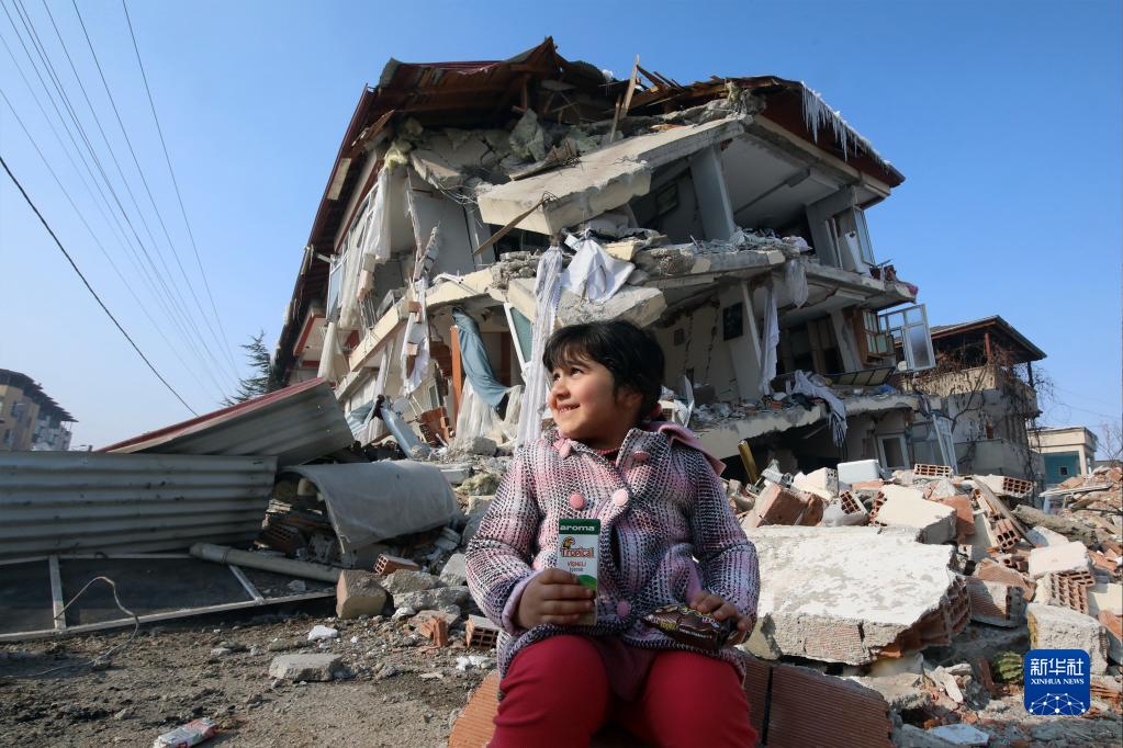 2月19日,在土耳其南部卡赫拉曼馬拉什省卡赫拉曼馬拉什市,一名兒童坐在建筑廢墟旁。