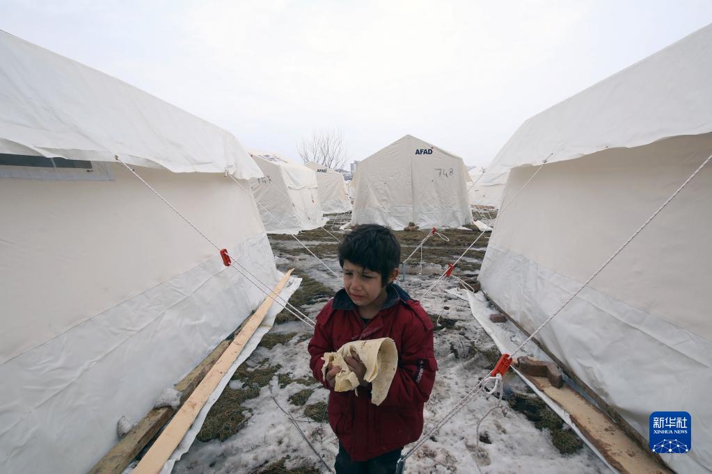 2月19日,在土耳其南部卡赫拉曼馬拉什省卡赫拉曼馬拉什市,一名兒童在居民安置點哭泣。