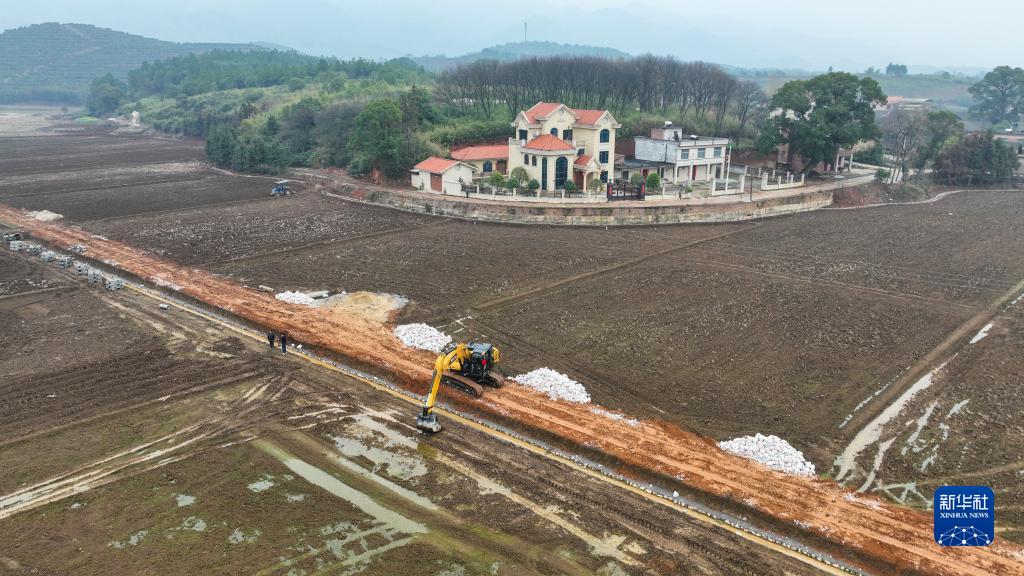 2月19日,施工人員在常寧市三角塘鎮塘沖村高標準農田建設現場修建排水渠(無人機照片)。